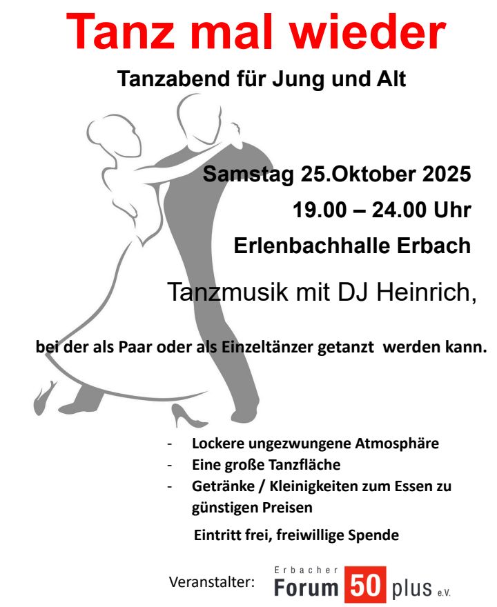 « Alle Veranstaltungen Diese Veranstaltung hat bereits stattgefunden. Tanzabend in der Erlenbachhalle Oktober 25 @ 19:00 – 23:30 Zum Kalender hinzufügen Google Kalender iCalendar Outlook 365 Outlook Live Tanzabend in der Erlenbachhalle